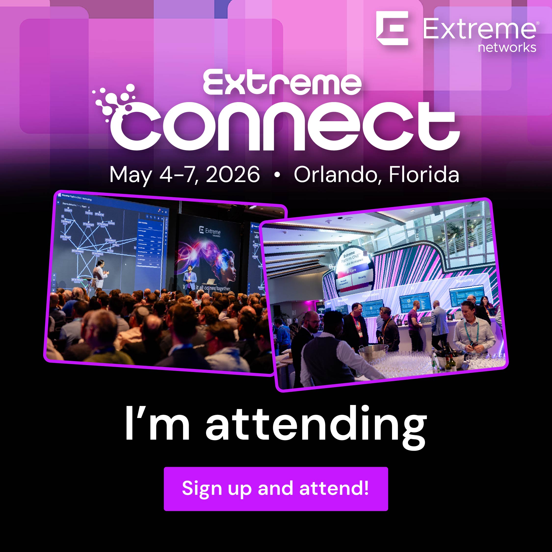 As intelligent connectivity, neural networks, and zero trust frameworks transform organizations worldwide, Extreme Networks empowers IT teams with groundbreaking solutions that simplify network management and security—putting you in control. Register now and get ready to discover the possibilities of the empowered enterprise at Extreme Connect in Orlando, Florida from May 4-7, our most epic event of the year. Experience the new extreme in networking. Extreme Connect is the place to explore the real results of AI-powered networking firsthand.